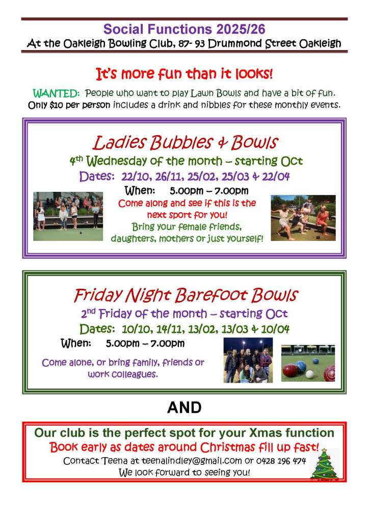 Please come and join us at our two monthly social functions this season. Starting on Friday 10th October – Friday Night Barefoot Bowls, AND from Weds 22nd October – Ladies Bubbles & Bowls.